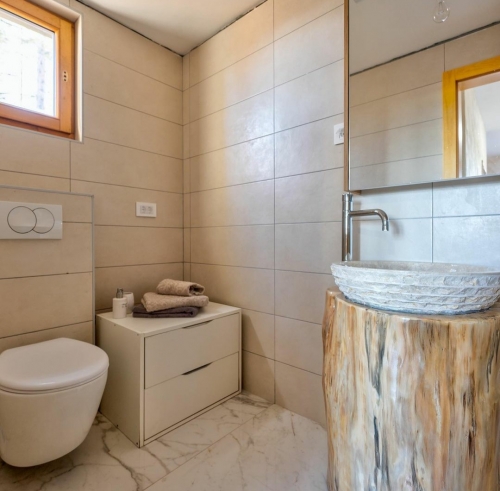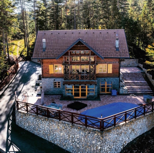 Vikendica površine 280 m2 izgrađena je na tri nivoa i predstavlja spoj etno i luksuznog stila. Kapacitet objekta je 10 – 12 soba.